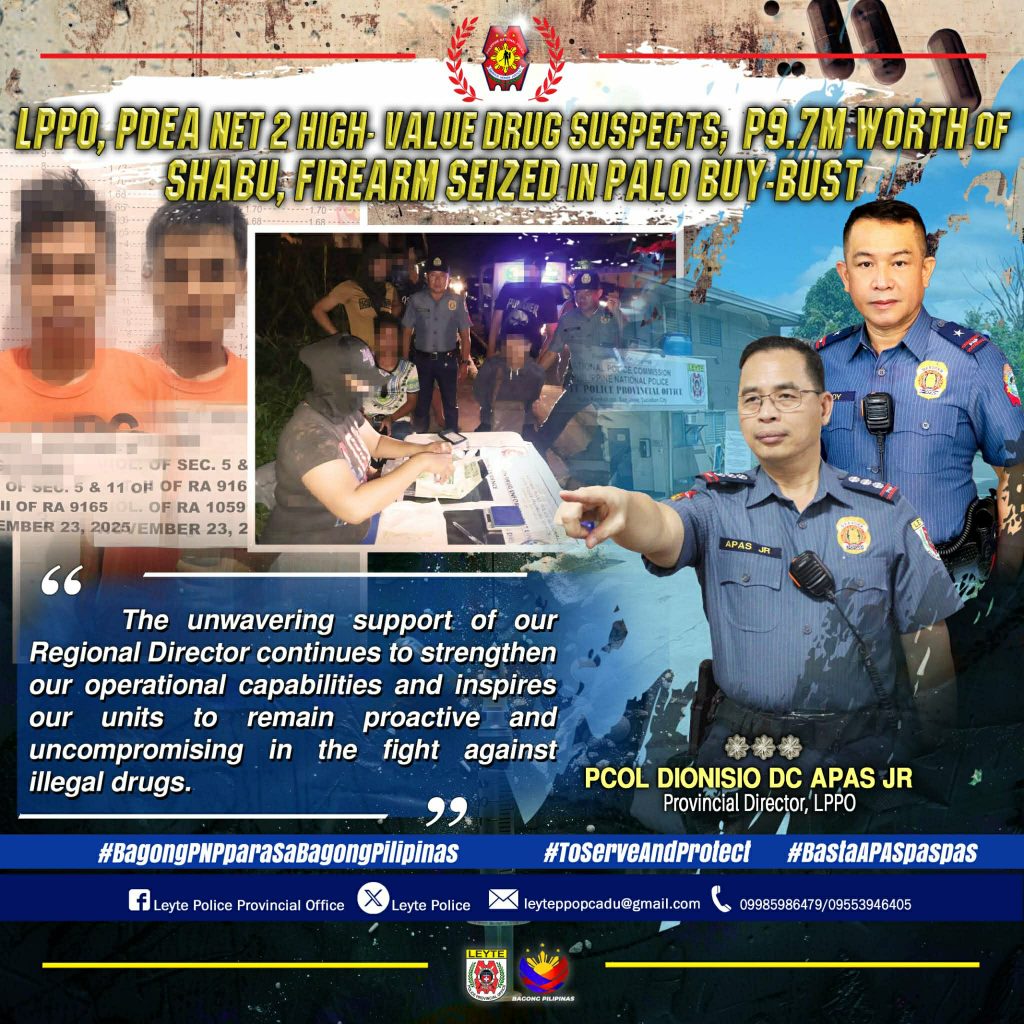 TACLOBAN CITY — Two high-value drug suspects were arrested and more than P9.7 million worth of suspected shabu was confiscated in a buy-bust operation conducted on the evening of November 23, 2025, in Zone Venus, Barangay Pawing, Palo, Leyte.