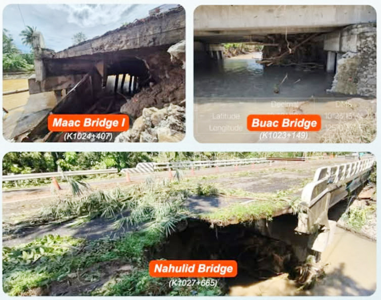 In an advisory issued on November 11, 2025, at 2 p.m., the DPWH identified the affected bridges as Maac Bridge I (K1024+407), Buac Bridge (K1023+149), and Nahulid Bridge (K1027+665).