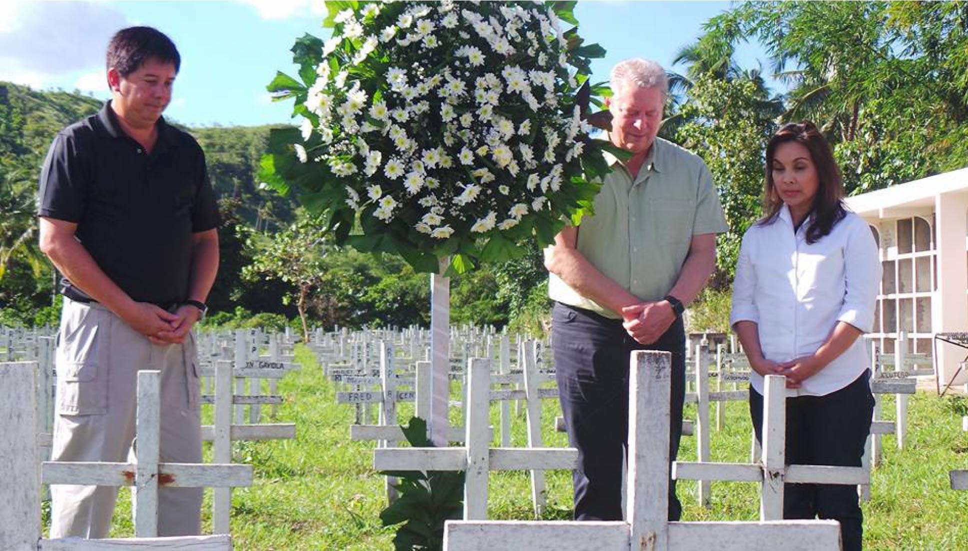 From the village, Gore went to the mass grave located at Holy Cross Memorial Park in Barangay Basper. In his 20-minute visit at the mass grave where 2,200 people who died due to Yolanda were buried, the US’ 45th Vice President offered a silent prayer in one of the graves. He also offered a wreath and lighted a candle together with Legarda and Romualdez. Romualdez briefed the visiting former US leader on how many were buried at the mass grave and how many of them were actually identified by their families. The government, through the National Bureau of Investigation, conducted its disaster victim’s identification (DVI) in an effort to identify those who perished due to Yolanda. On his way to the City Hall, Gore’s convoy stopped at the Yolanda shipwreck memorial at the Anibong district. The shipwreck, consisting of a bow of the MV Eva Jocelyn, a commercial ship that was beached inland due to the storm surge, was converted into a memorial park which is now fast-emerging as Tacloban’s most visited “place of interest.”