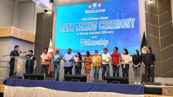PNP-8 Regional Director B/Gen. Rommel Francisco Marbil swore in the newly-elected officials of the PNP-8 Press Corps on Saturday (Feb.4). Ioannes Paulos Omang of DyVL Aksyon Radyo was elected president, replacing Roel Amazona of this paper and CNN-Philippines. (RONALD O. REYES)