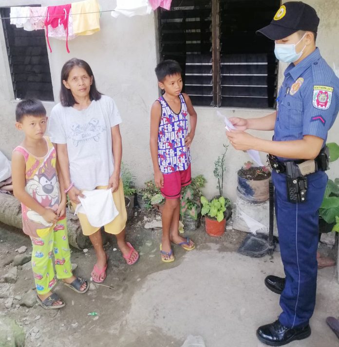 A local police from San Ricardo, Southern Leyte conducts interview to Joselyn Murillo,49, and her two grandsons John Mark,9, and France Mhyrell,8 after their motorized pump boat capsized off the waters in San Ricardo. Also on board were her son, Edgar and his wife, Belinda. (San Ricardo MPS)