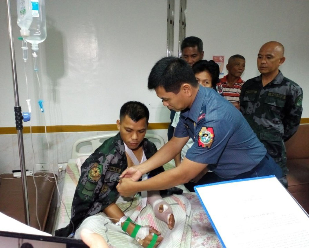 PNP Eastern Visayas Regional Director Chief Supt. Elmer Beltejar pinned the medal to Police Officer 1 Ringy Boy Tomale assigned at the Provincial Public Safety Company based in Catbalogan City at his hospital room at the Divine Word Hospital Wednesday (July 26) night.