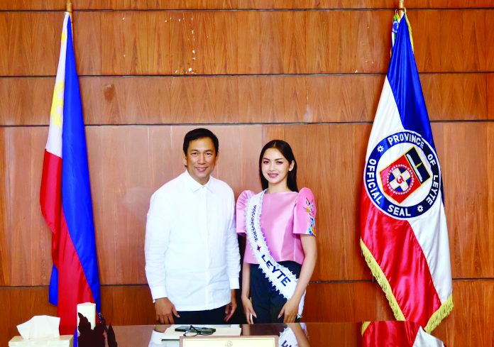 GOOD LUCK. This year’s representative of Leyte to the Miss Universe-Philippines, Kareyl May Cabahug, will bring with herself in the Miss Universe Philippines competition smart and sustainable modern farming through biotechnology, highlighting Leyte’s agricultural roots. Photo shows the beauty queen with Leyte Gov. Carlos Jericho ‘Icot’ Petilla during her recent visit to the governor at his office. (PHOTO COURTESY)