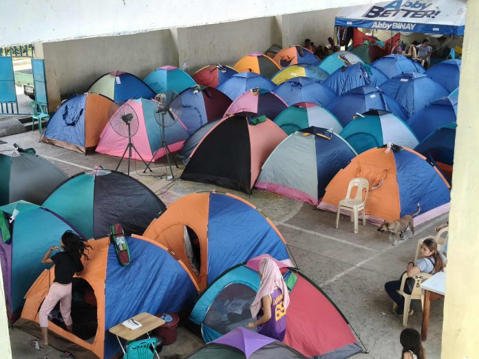 More than 600 residents of Sitio Bagong Baryo, Brgy Tagbubunga, Villaba, Leyte are temporarily staying in tents and classrooms due to the threat of rock slide.