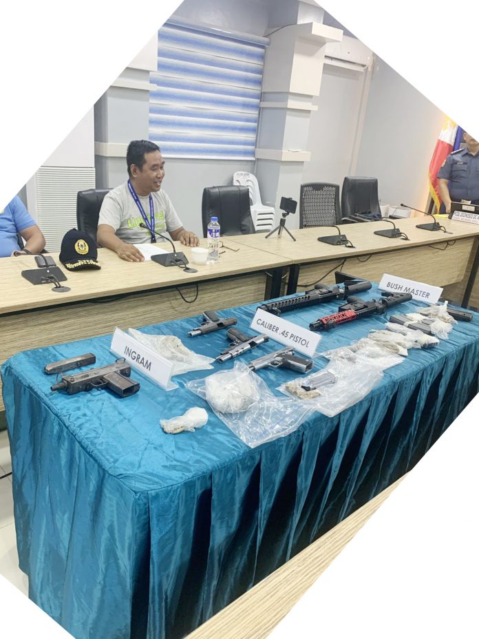 Confiscated from the suspects’ possession and the vehicle were three .45 caliber pistols, each with a loaded magazine; one Ingram submachine gun with a loaded 9mm magazine; two long firearms with loaded 5.56mm magazines; and 36 transparent plastic sachets containing a white crystalline substance suspected to be shabu, with an estimated Dangerous Drug Board value of P242,000; and cash amounting to approximately P97,174.00 in different denominations.