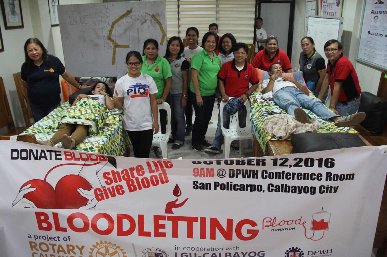 CALBAYOG CITY-In celebration of the National Blood Donors Month bannered “Blood connects us all. Share LIFE give BLOOD”, the Department of Public Works and Highways – Samar First District Engineering Office (SFDEO) jointly facilitated a grand bloodletting activity at SFDEO conference room, October 12, 2016. Out of 46 SFDEO employees who are enlisted for blood donation, only 12 employees passed the initial screening. About 36 employees failed from the series of tests due to high/low blood pressure, low hemoglobin and “not prominent”. Tests are conducted to ensure that donors are safe to donate their bloods. The activity is a joint effort of the Rotary Club of Calbayog, LGU Calbayog represented by its medical team from the City Health Office, Philippine Institute of Civil Engineers (PICE) Calbayog Chapter, and DPWH-SFDEO. Engr. Raquel Y. Sumayo, chief of the Quality Assurance Section SFDEO, and president of Rotary Calbayog, agreed to the proposal that this activity be conducted annually. (PR)